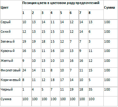 Нами также было проведено исследование цветовых предпочтений взрослых обоего пола в возрасте от 16 до 70 лет. Усредненный ранговый ряд их цветовых выборов имел следующий вид: