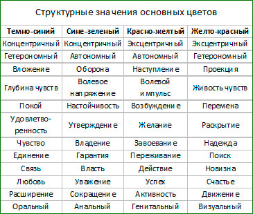 Ядро теоретической концепции М. Люшера составляют два понятия — «структура» и «функция» цвета.Под «структурой» цвета понимается устойчивое, общее для всех людей, независимо от расы, культуры, образовательного уровня, пола и возраста значение этого цвета. «Структуру» можно назвать «объективной» стороной цветового воздействия. В таблице 4.1.3.1 приводится «структура» 4-х «основных» цветов по М. Люшеру.