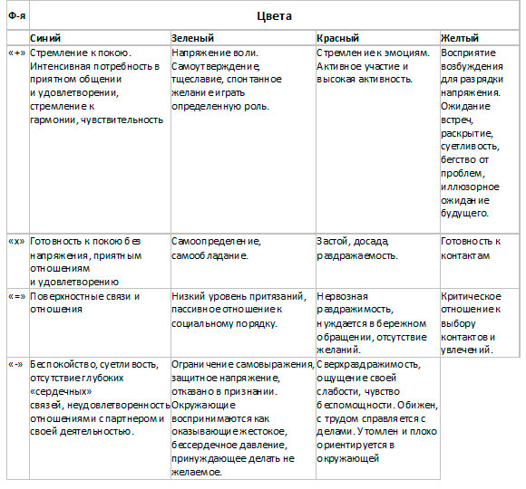 Функция «+» в таблице 2 цветового теста Люшера означает усиление потребности, выражаемой данным цветом, «х» — переживание состояний, связанных с ее удовлетворением, «=» — неактуальность потребности на данный момент, «-» — невозможность или нежелательность удовлетворения потребности, а следовательно ее фрустрацию и связанную с этим первичную защиту или «оборонительную» тактику поведения, тогда как, цвета с функцией «+» отражают «наступательную» тактику и вторичную компенсацию.