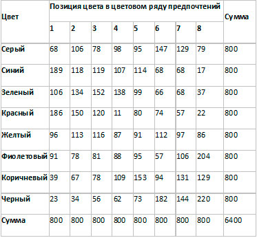 В таблице 2.2.3.3. приводится частота (в %) появления каждого цвета на каждой из 8-ми позиций цветового теста Люшера. Нетрудно подсчитать, что, если бы цветовые выборы испытуемых распределялись случайным образом, то частота появления любого цвета на любом из мест должна была бы приближаться к значению 12.5%. Однако, как показывает статистический анализ, в том числе и методом «хи-квадрат», для большинства цветов этого не наблюдается, особенно, для зеленого, фиолетового, коричневого и черного. Наиболее близко к показателю случайности оказалось распределение выборов серого цвета.